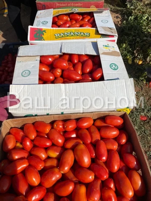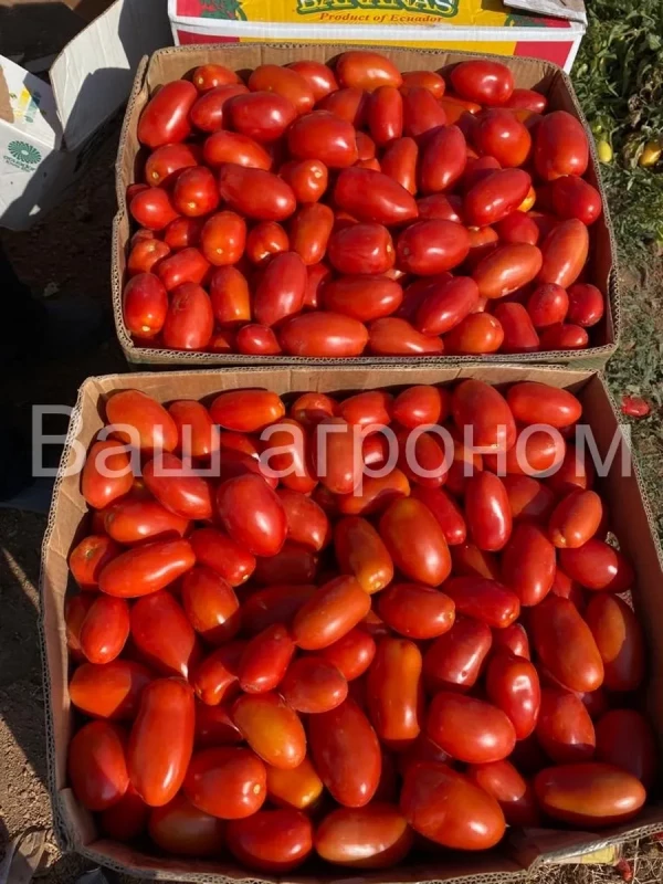 Плоды сливовидной формы, красного цвета, весом 120–140 г, однородные по размеру и форме. Мякоть плотная и сахаристая, содержание сухих веществ 4,9–5,2%, общий сахар 2,4–3,0%. Гибрид отличается дружным созреванием, высокой транспортабельностью и возможностью длительного хранения плодов.