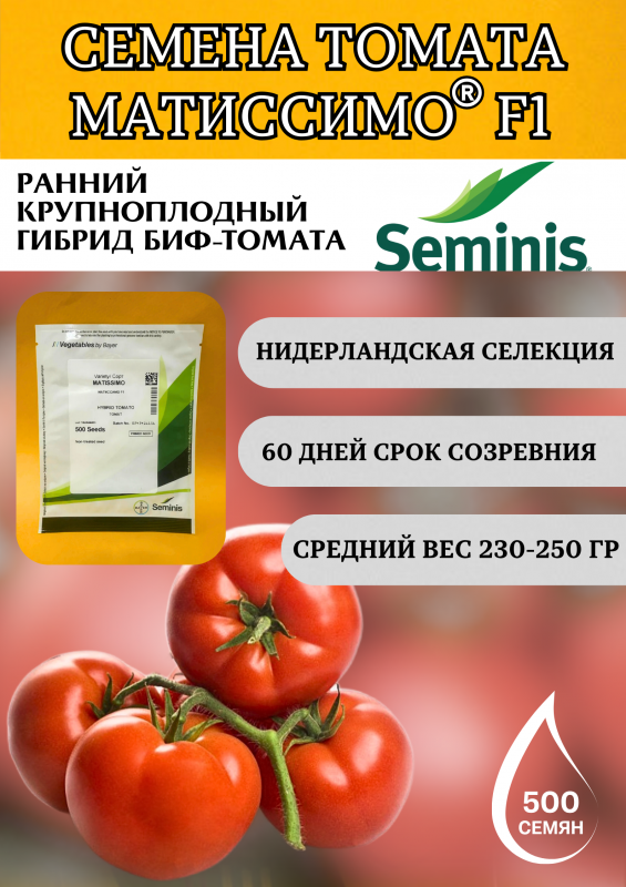 Матиссимо F1 – это ранний индетерминантный биф-томат с периодом созревания всего 60 дней, который сочетает высокую урожайность, крупные плоды и устойчивость к болезням. Гибрид отлично подходит для выращивания в теплицах и открытом грунте, особенно для первого оборота, но также успешно плодоносит во втором обороте.