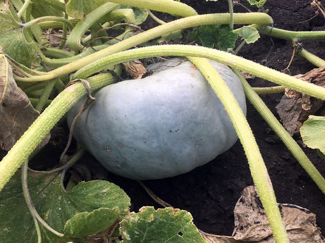 Плоды плоскоокруглой формы, без ребер, массой 3-5 кг. Имеют оригинальную серую окраску кожуры и плотную оранжевую мякоть, которая быстро набирает вкус после уборки. Гибрид отличается высокой устойчивостью к механическим повреждениям при уборке, что критически важно для коммерческого производства.